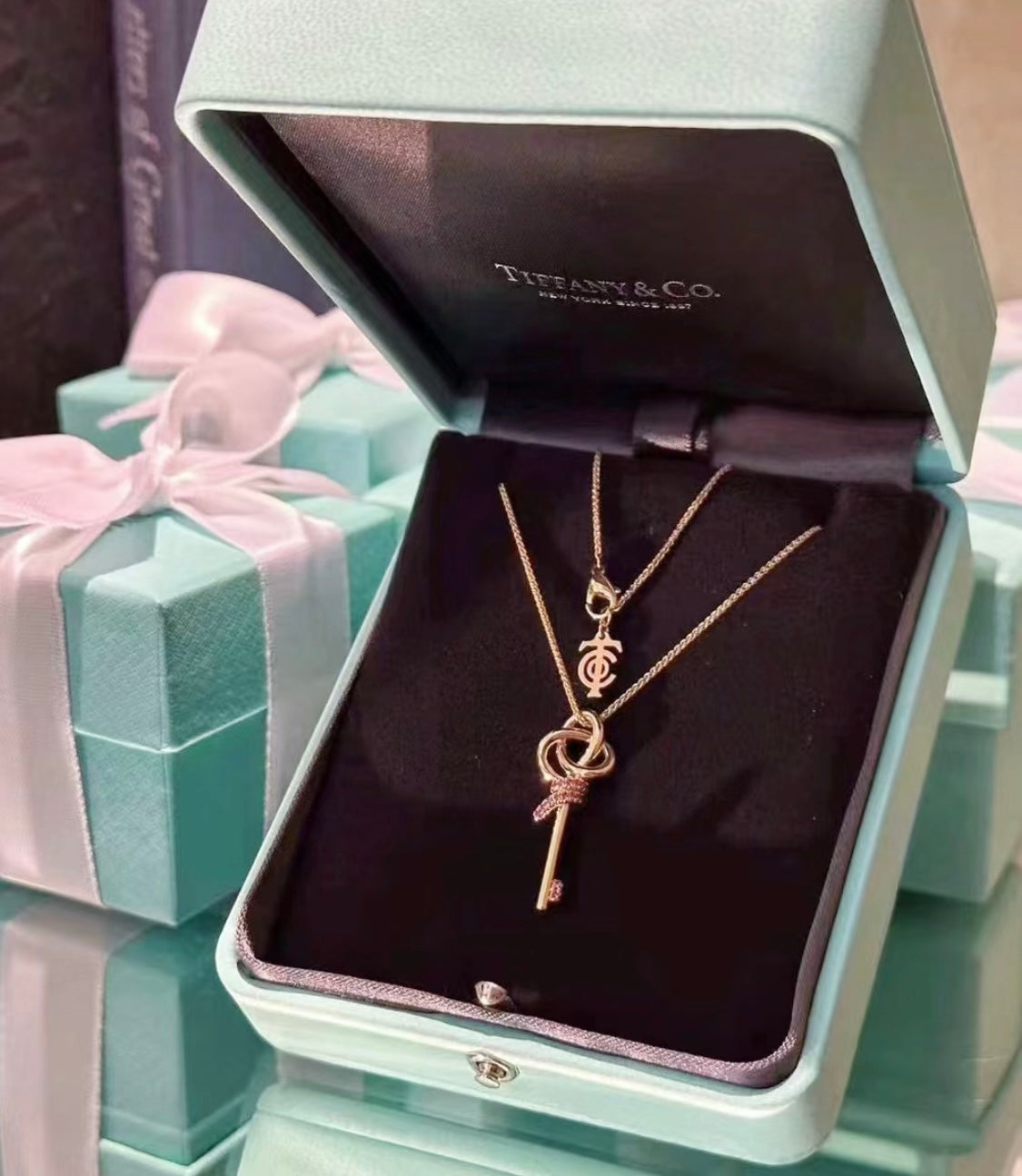18K T Keys Woven Pink Diamonds Medium Necklace